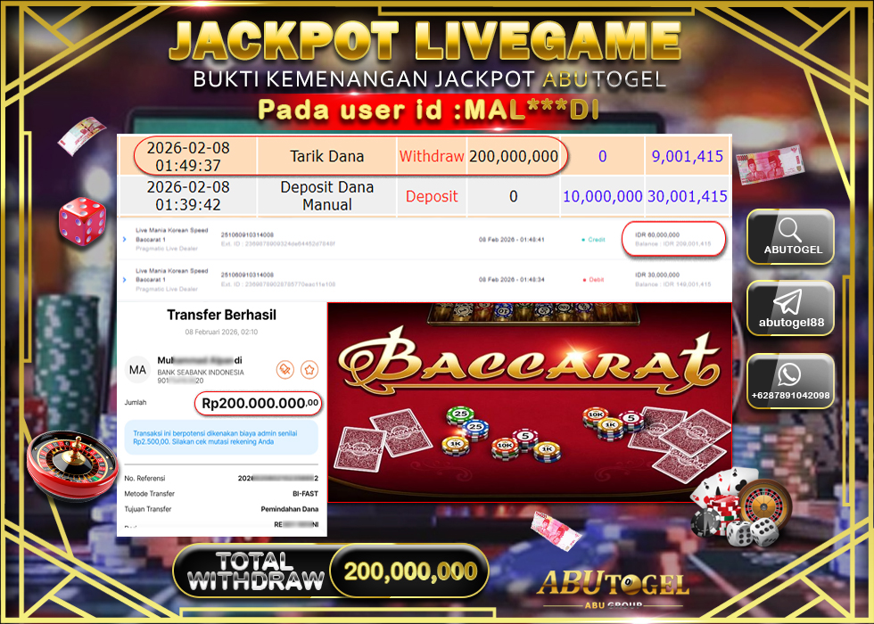 Bukti Jackpot Live Casino Online ABUTOGEL Minggu, 08 February 2026 – ABUTOGEL adalah bo online terpercaya. Berikut ini kami berikan info bukti jackpot member ABUTOGEL yang sudah kami bayar lunas dalam permainan live casino online.