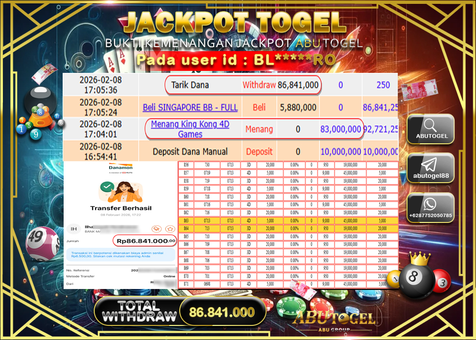 Bukti Jackpot Togel Online ABUTOGEL Minggu 08 February 2026 Rp. 86,841,000 - LUNAS