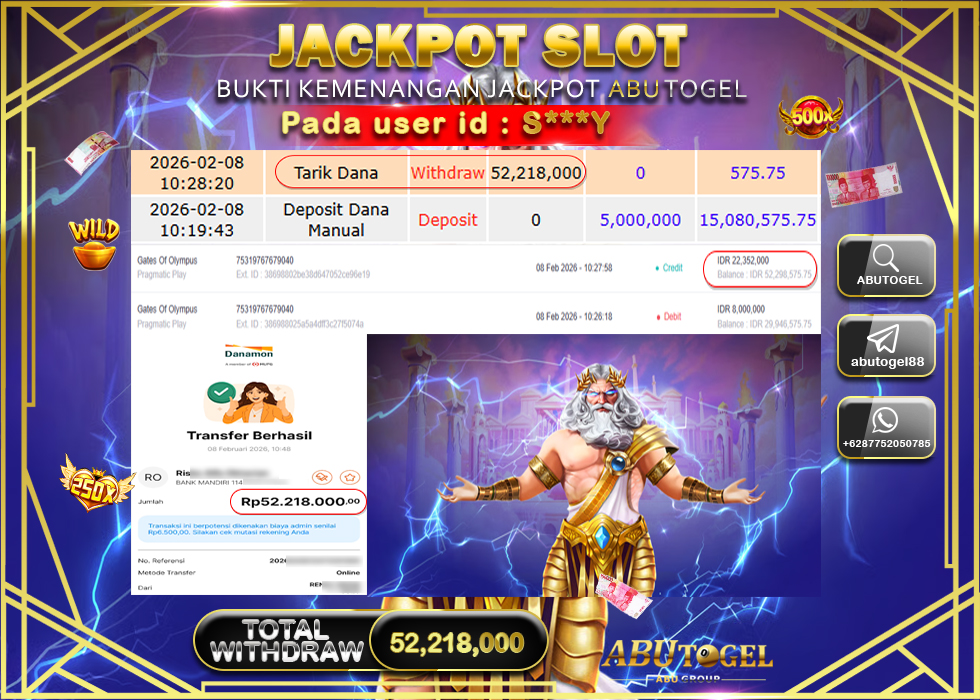 Bukti Jackpot Slot Online ABUTOGEL Minggu, 08 February 2026 Rp 52,218,000 - LUNAS