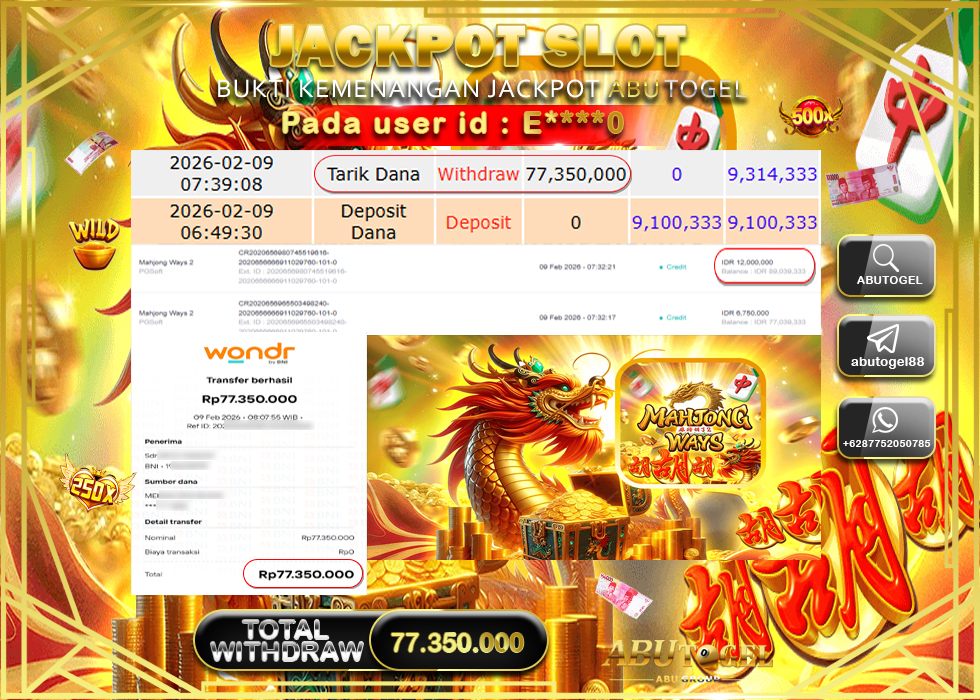 Bukti Jackpot Slot Online ABUTOGEL Senin, 09 February 2026 Rp 77,350,000 - LUNAS