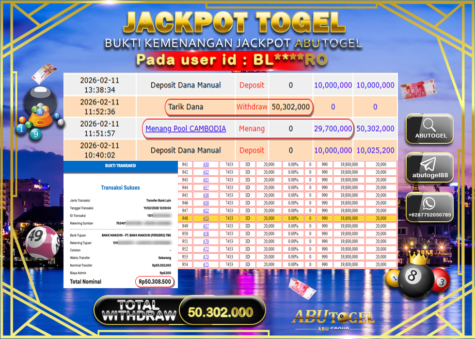 Bukti Jackpot Togel Online ABUTOGEL Rabu, 11 February 2026 Rp. 50,302,000 - LUNAS