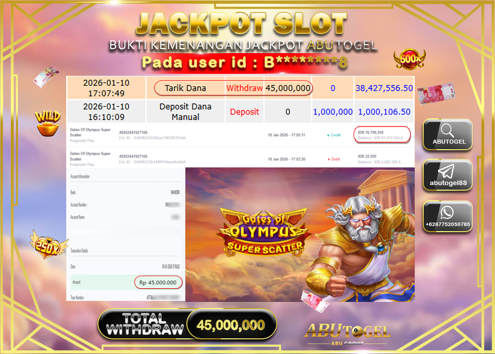 Bukti Jackpot Slot Online ABUTOGEL Sabtu 10 January 2026 Rp. 45,000,000 - LUNAS