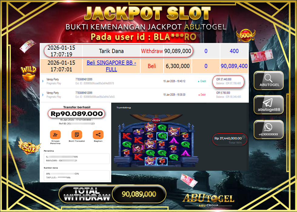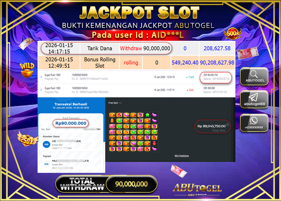 Bukti Jackpot Slot Online ABUTOGEL Jumat 16 January 2026 Rp. 90,089,000 - LUNAS
