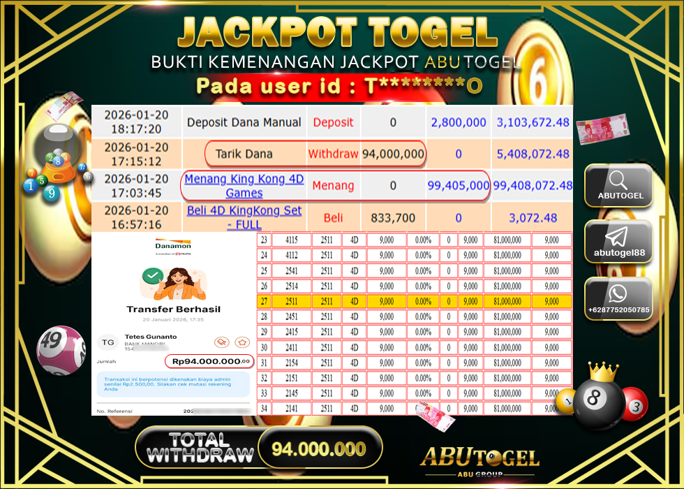 Bukti Jackpot Togel Online ABUTOGEL Selasa 20 January 2026 Rp. 99,405,000 - LUNAS