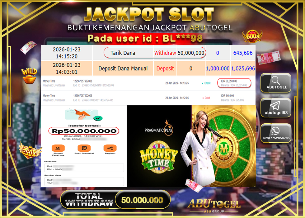 Bukti Jackpot Slot Online ABUTOGEL Jumat 23 January 2026 Rp. 50,050,000 - LUNAS