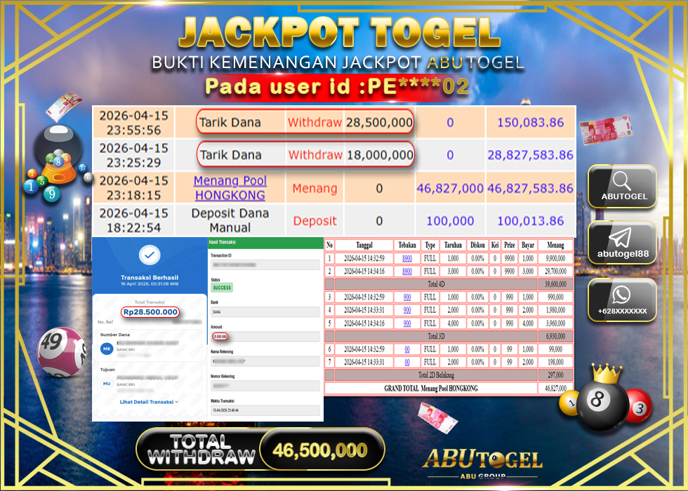 Bukti Jackpot Togel Online ABUTOGEL Rabu, 15 April 2026 Rp 46,500,000 - LUNAS