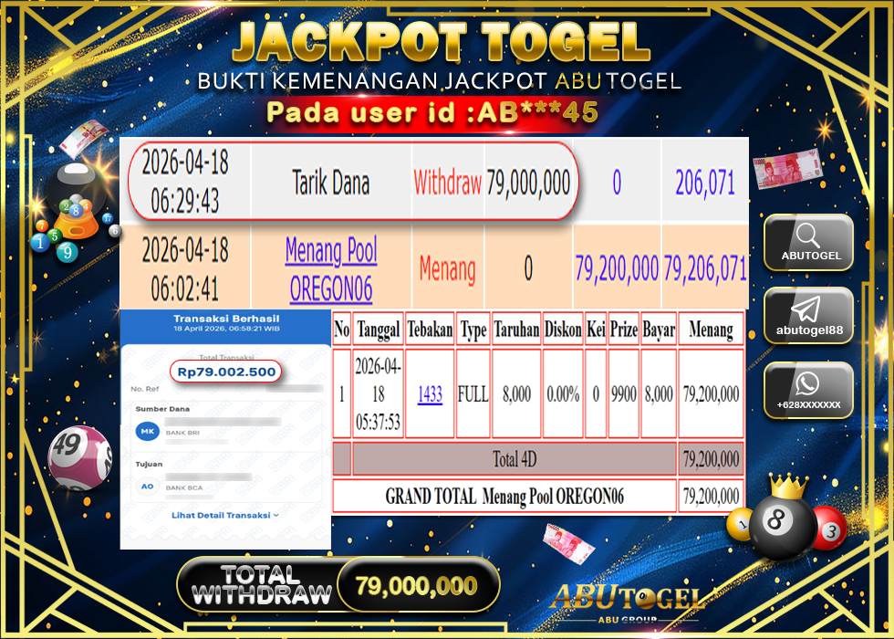 Bukti Jackpot Togel Online ABUTOGEL Sabtu, 18 April 2026 Rp 79,000,000 - LUNAS