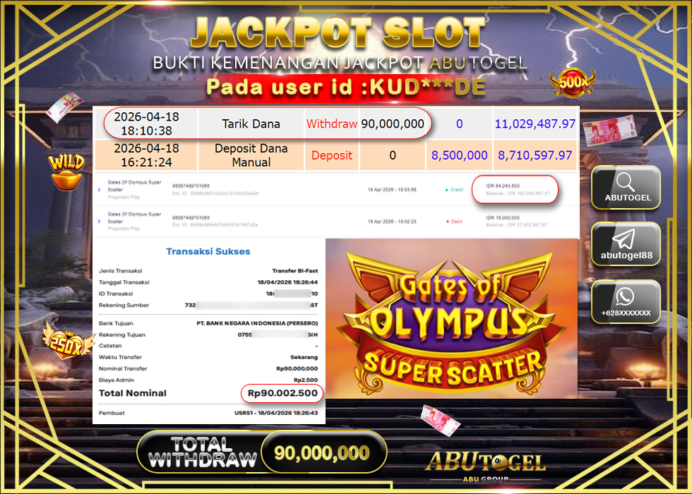 Bukti Jackpot Slot Online ABUTOGEL Sabtu, 18 April 2026 RP 90,000,000 - LUNAS