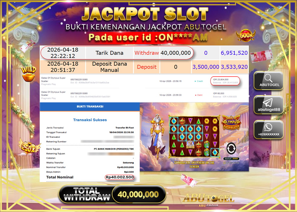 Bukti Jackpot Slot Online ABUTOGEL Sabtu, 18 April 2026 RP 40,000,000 - LUNAS