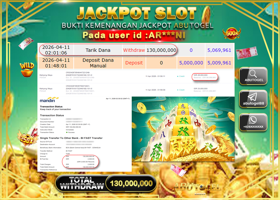 Bukti Jackpot Slot Online ABUTOGEL Sabtu, 11 April 2026 Rp 130,000,000 - LUNAS