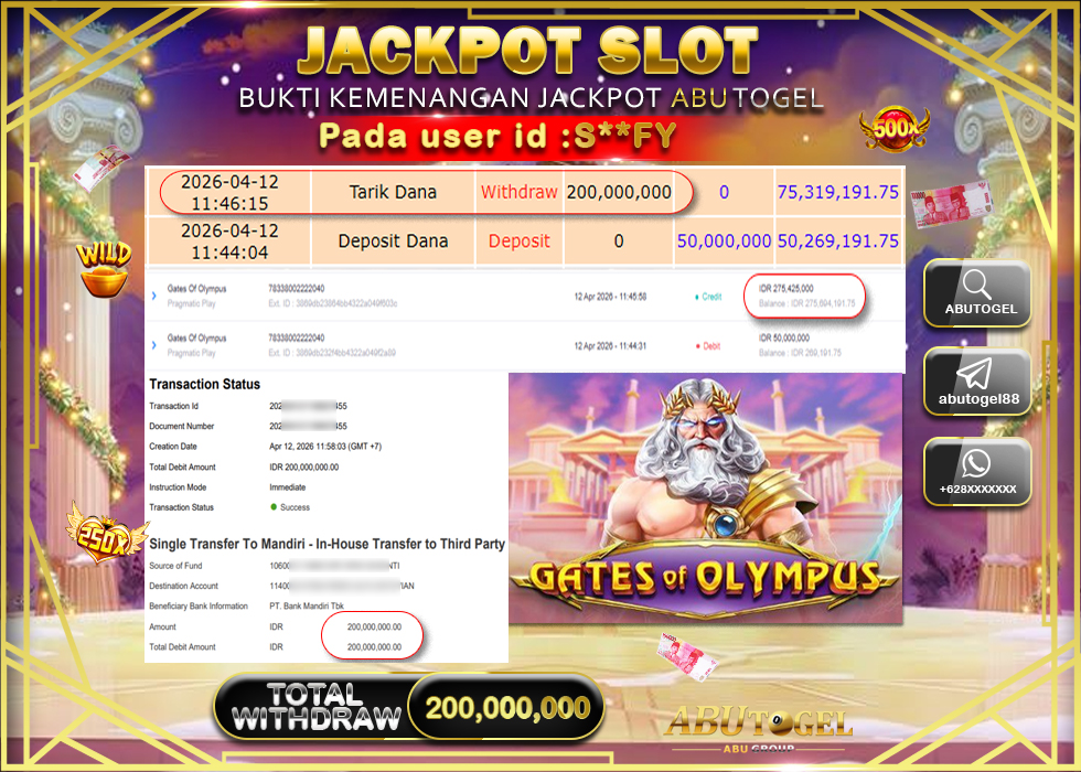 Bukti Jackpot Slot Online ABUTOGEL Minggu, 12 April 2026 Rp 200,000,000 - LUNAS