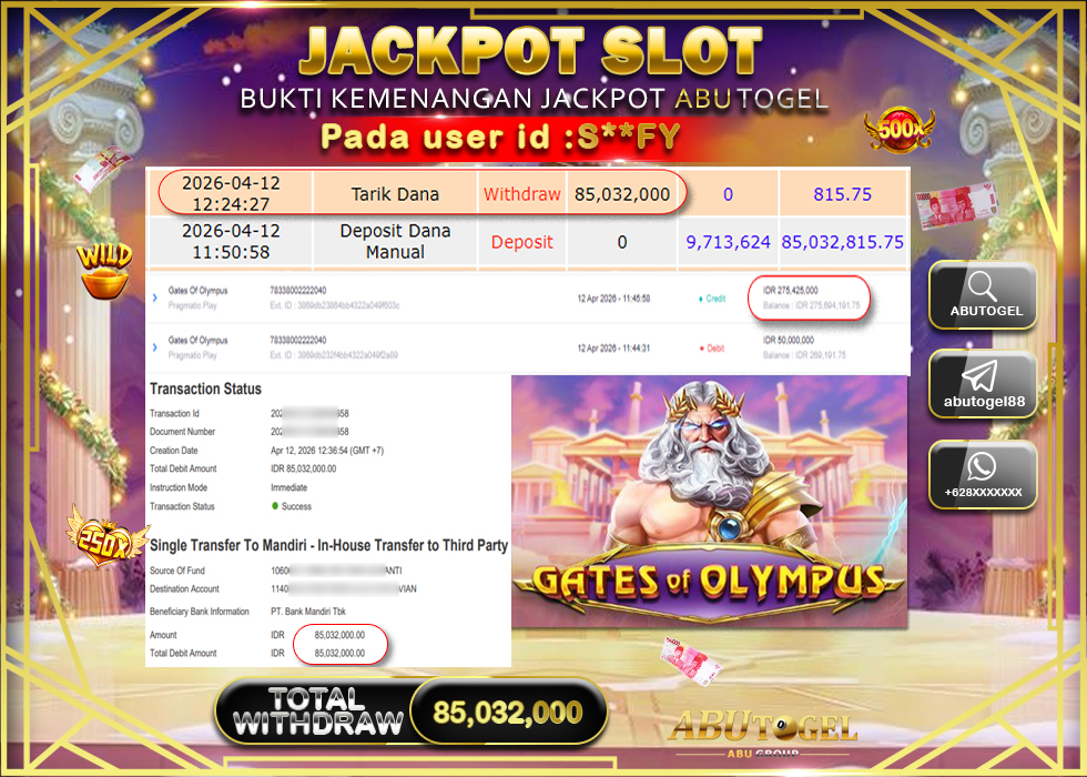 Bukti Jackpot Slot Online ABUTOGEL Minggu, 12 April 2026 RP 85,032,000 - LUNAS