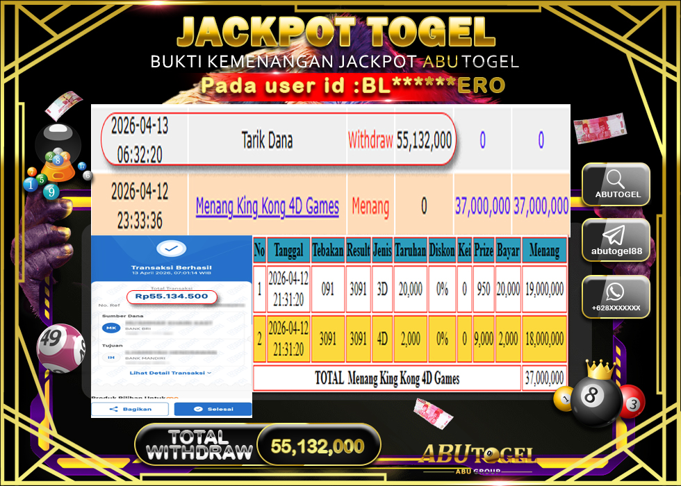 Bukti Jackpot Togel Online ABUTOGEL Senin, 13 April 2026 Rp 55,132,000 - LUNAS