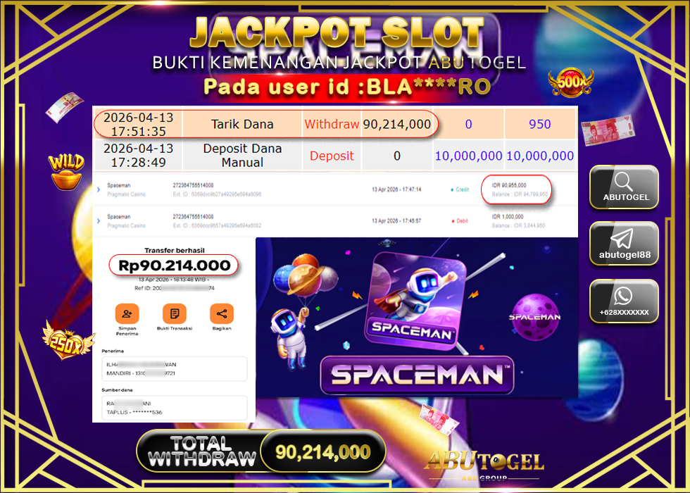 Bukti Jackpot Slot Online ABUTOGEL Senin, 13 April 2026 RP 90,214,000 - LUNAS