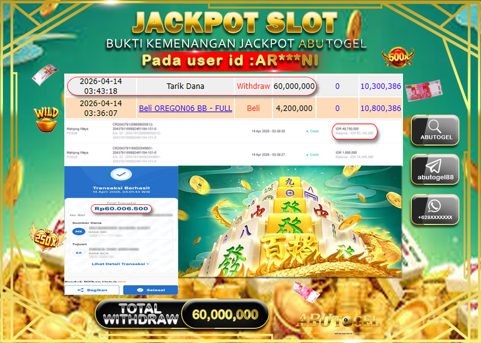 Bukti Jackpot Slot Online ABUTOGEL Selasa, 14 April 2026 RP 60,000,000 - LUNAS