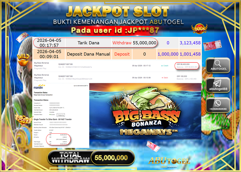 Bukti Jackpot Slot Online ABUTOGEL Minggu, 05 April 2026 Rp 55,000,000 - LUNAS