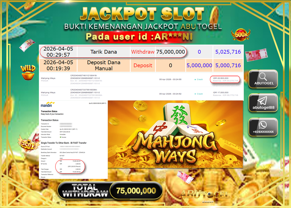 Bukti Jackpot Slot Online ABUTOGEL Minggu, 05 April 2026 Rp 75,000,000 - LUNAS
