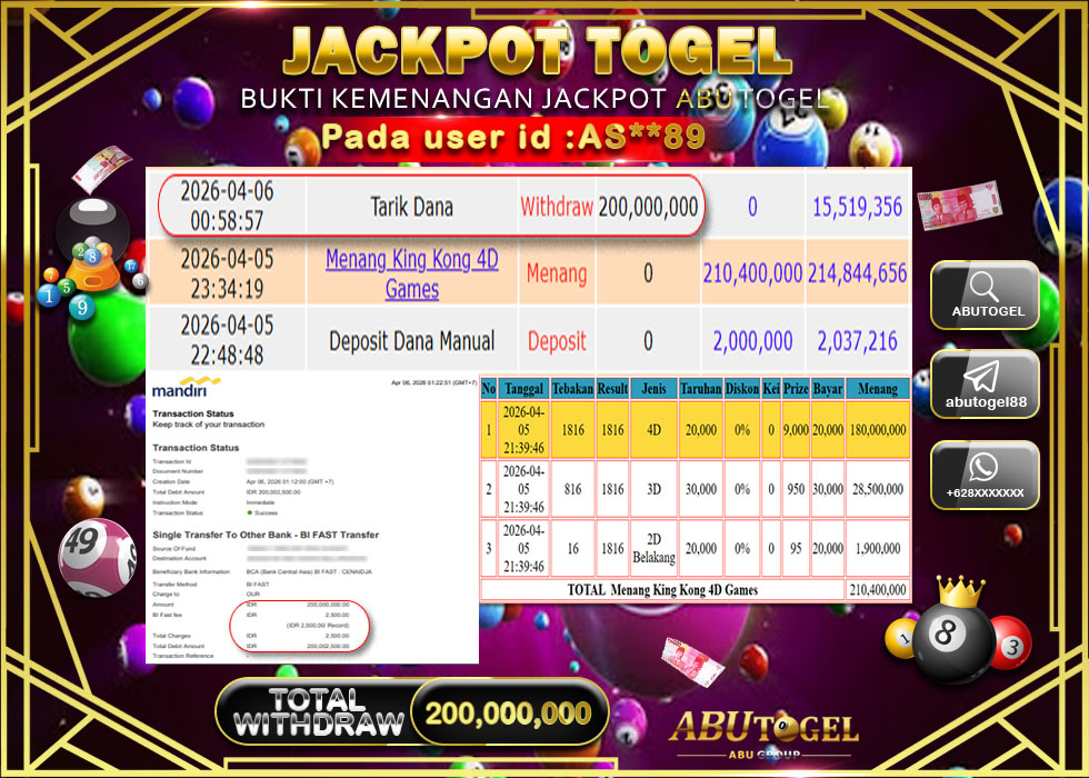 Bukti Jackpot Togel Online ABUTOGEL Senin, 06 April 2026 Rp 200,000,000 - LUNAS
