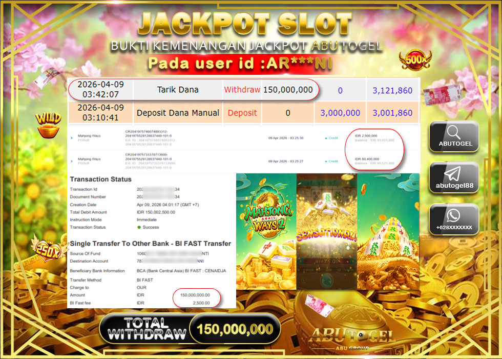 Bukti Jackpot Slot Online ABUTOGEL Kamis, 09 April 2026 Rp 150,000,000 - LUNAS