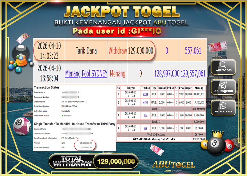 Bukti Jackpot Togel Online ABUTOGEL Jumat, 10 April 2026 Rp 129,000,000 - LUNAS
