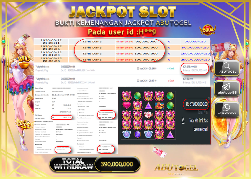 Bukti Jackpot Slot Online ABUTOGEL Minggu, 22 Maret 2026 Rp 390,000,000 - LUNAS