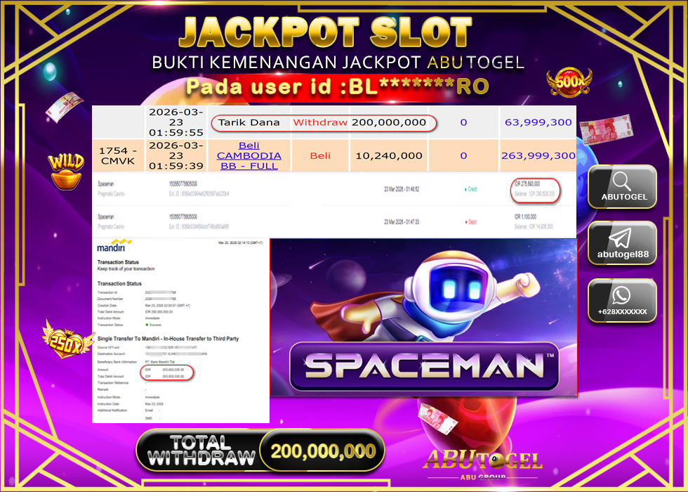Bukti Jackpot Slot Online ABUTOGEL Senin, 23 Maret 2026 Rp. 200,000,000 - LUNAS