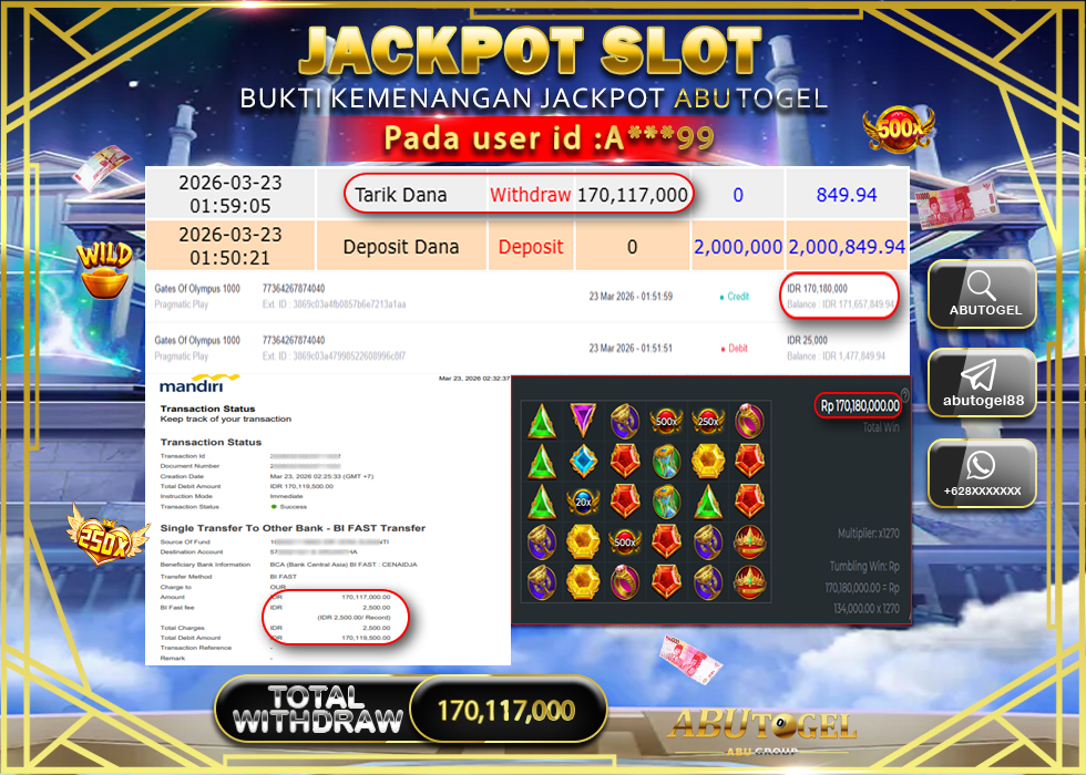 Bukti Jackpot Slot Online ABUTOGEL Senin, 23 Maret 2026 Rp. 170,117,000 - LUNAS
