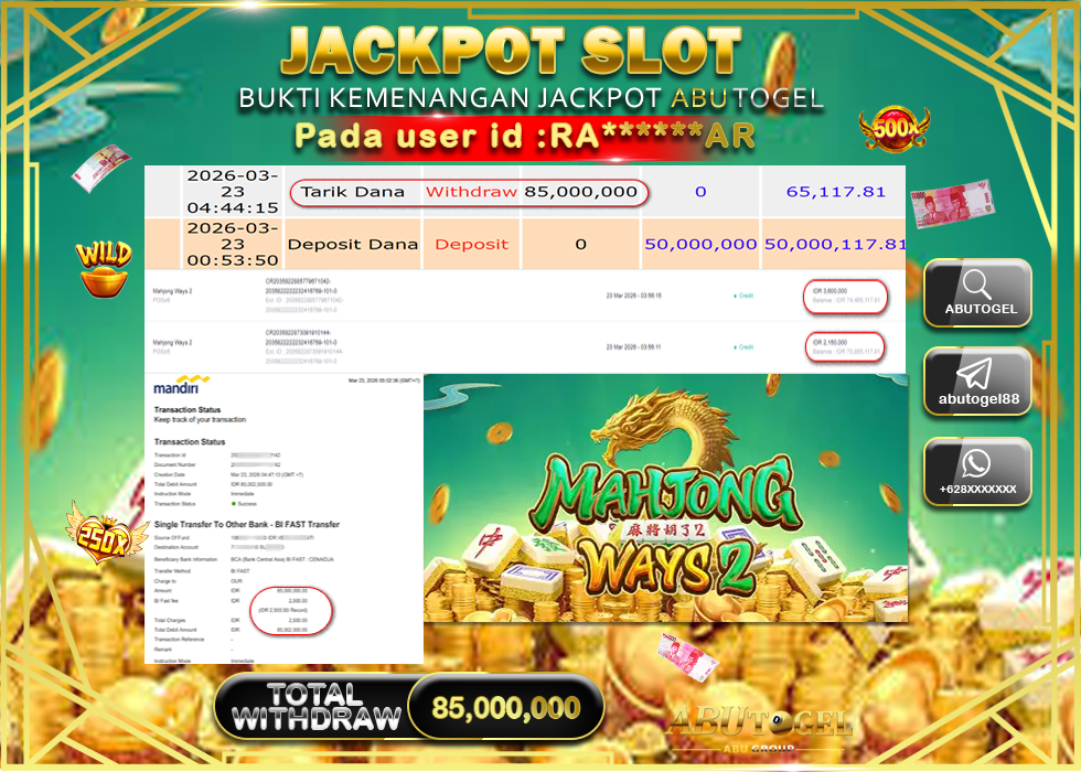 Bukti Jackpot Slot Online ABUTOGEL Senin, 23 Maret 2026 – ABUTOGEL adalah bo online terpercaya. Berikut ini kami berikan info bukti jackpot member ABUTOGEL yang sudah kami bayar lunas dalam permainan slot online.