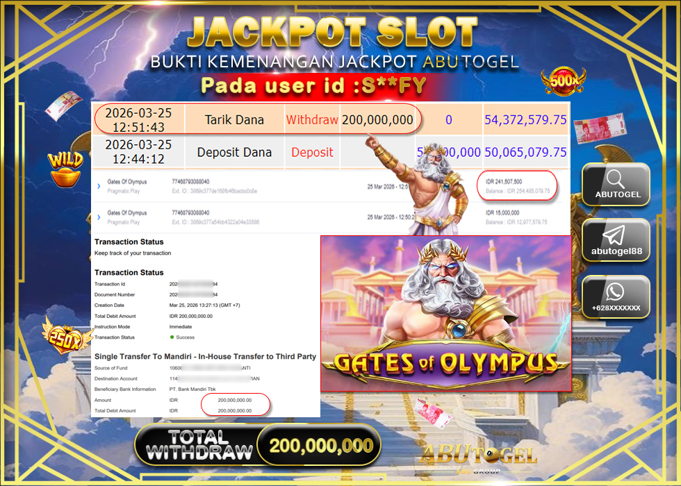 Bukti Jackpot Slot Online ABUTOGEL Rabu, 25 Maret 2026 RP. 200,000,000 - LUNAS