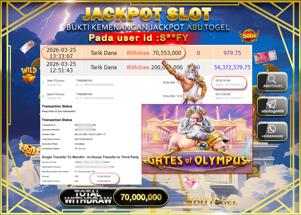 Bukti Jackpot Slot Online ABUTOGEL Rabu, 25 Maret 2026 RP. 70,553,000 - LUNAS