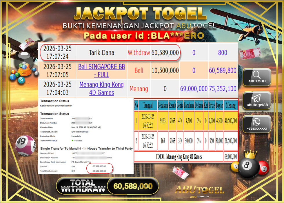 Bukti Jackpot Togel Online ABUTOGEL Rabu, 25 Maret 2026 Rp 60,589,000 - LUNAS