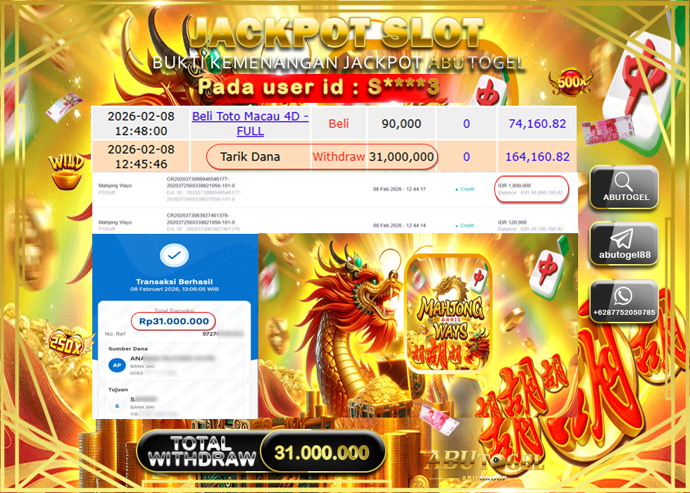 Bukti Jackpot Slot Online ABUTOGEL Minggu, 08 February 2026 Rp 31,000,000 - LUNAS