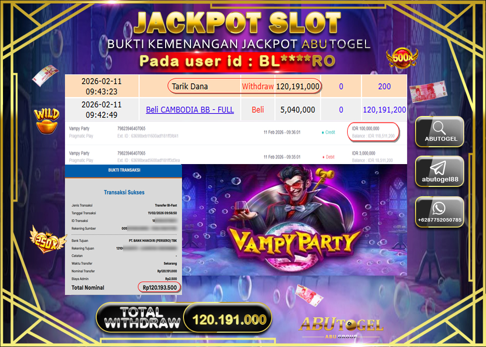 Bukti Jackpot Slot Online ABUTOGEL Rabu, 11 February 2026 Rp 120,191,000 - LUNAS