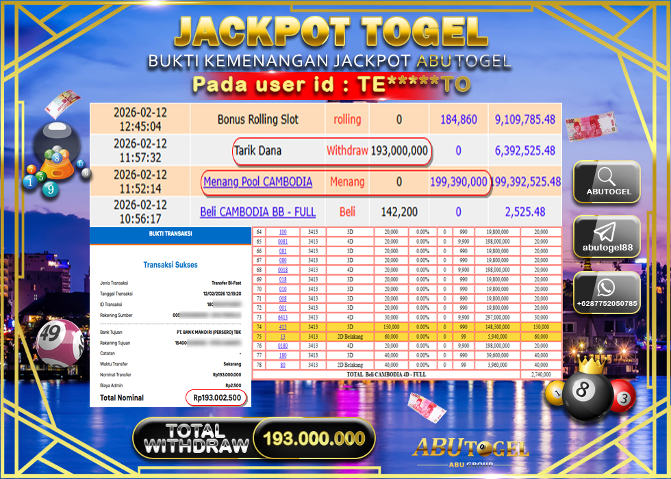 Bukti Jackpot Togel Online ABUTOGEL Kamis, 12 February 2026 Rp. 193,000,000 - LUNAS