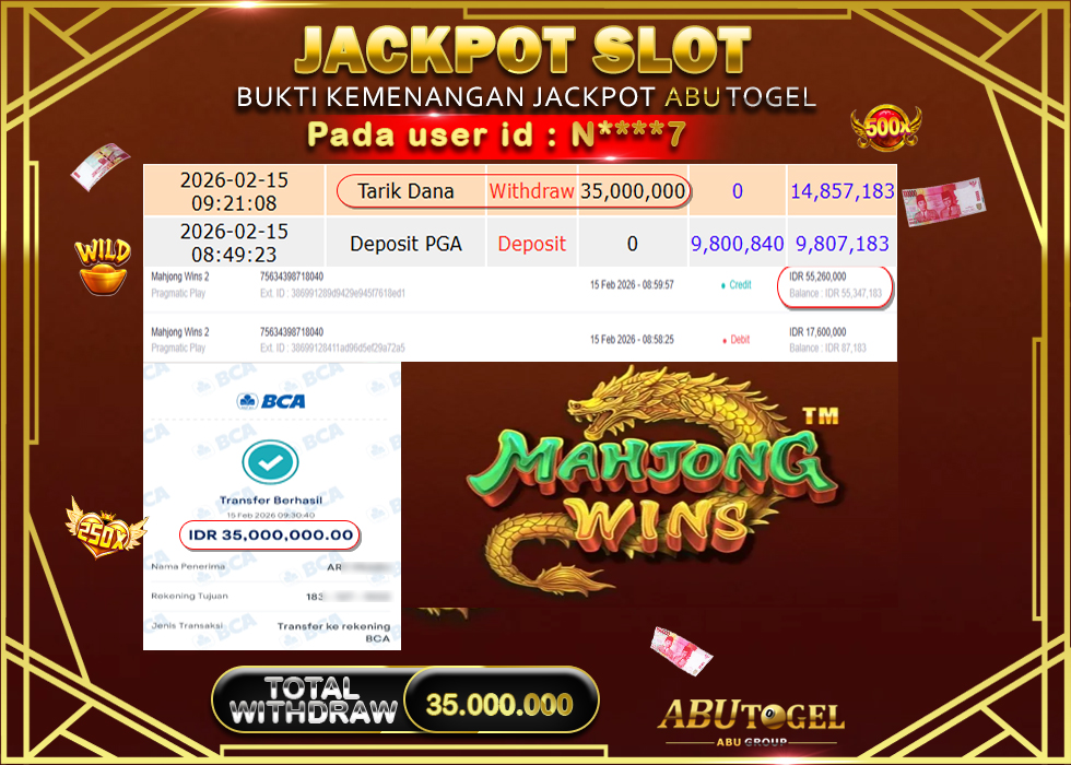 Bukti Jackpot Slot Online ABUTOGEL Minggu, 15 February 2026 Rp 35,000,000 - LUNAS