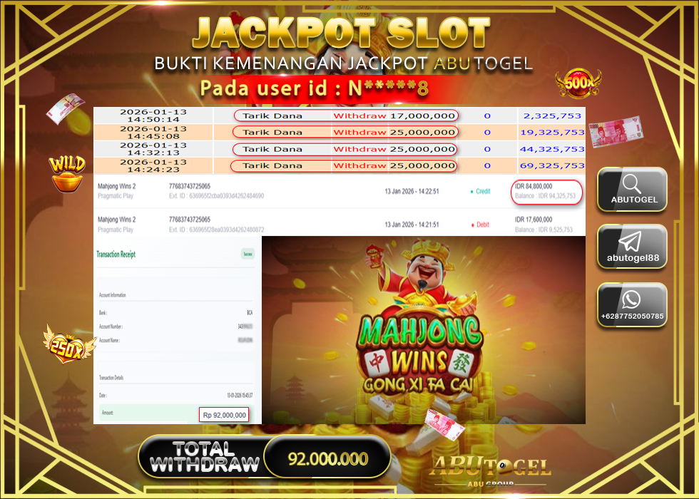 Bukti Jackpot Slot Online ABUTOGEL Selasa, 13 January 2026 Rp. 92,000,000 - LUNAS
