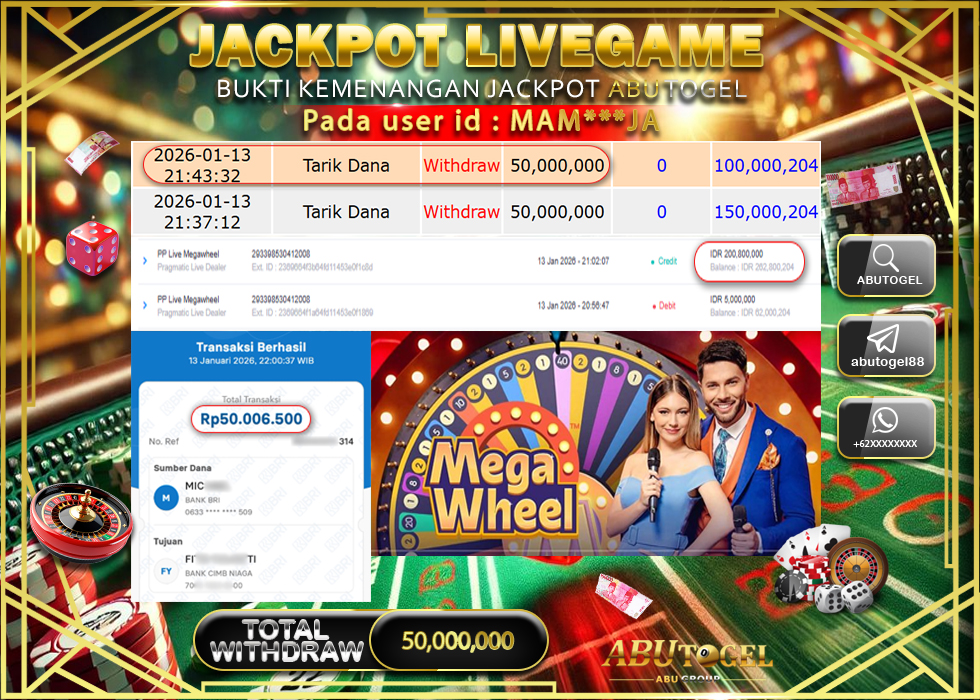 Bukti Jackpot Live Casino Online ABUTOGEL Rabu 14 January 2026 Rp. 50,000,000 - LUNAS