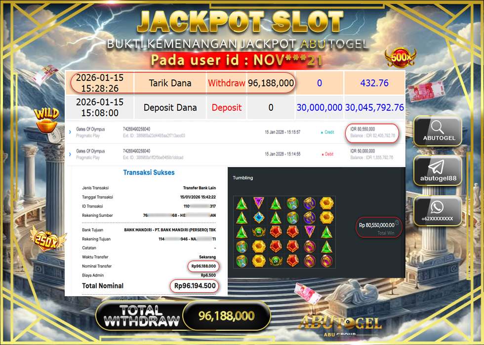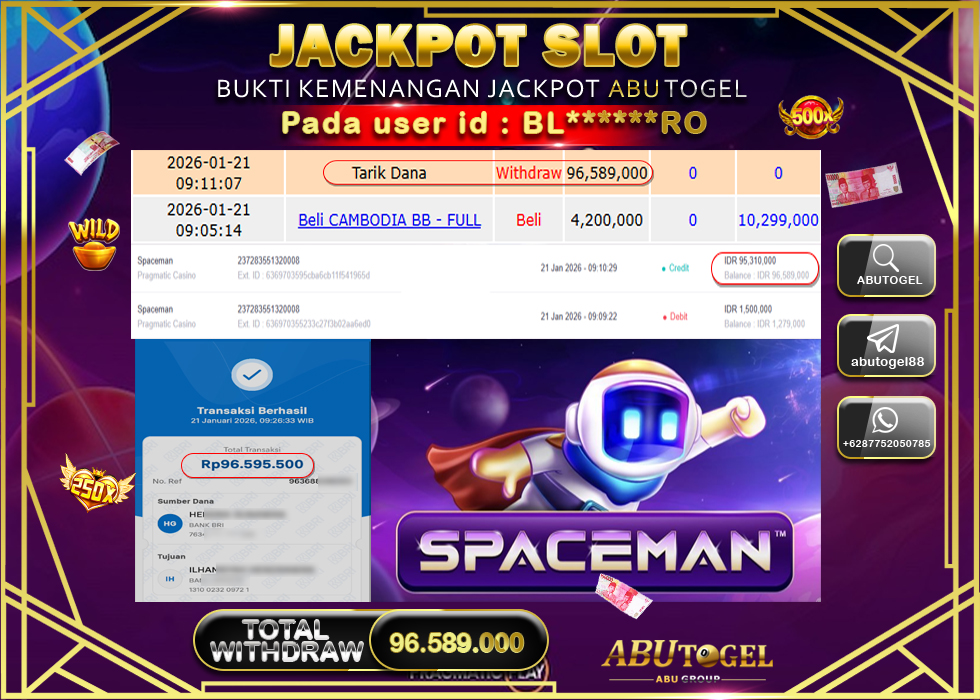 Bukti Jackpot Slot Online ABUTOGEL Rabu 21 January 2026 Rp, 95,316,000 - LUNAS