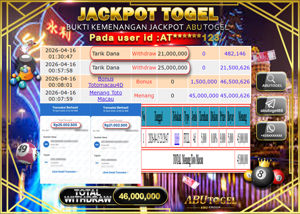 Bukti Jackpot Togel Online ABUTOGEL Kamis, 16 April 2026 Rp 46,000,000 - LUNAS
