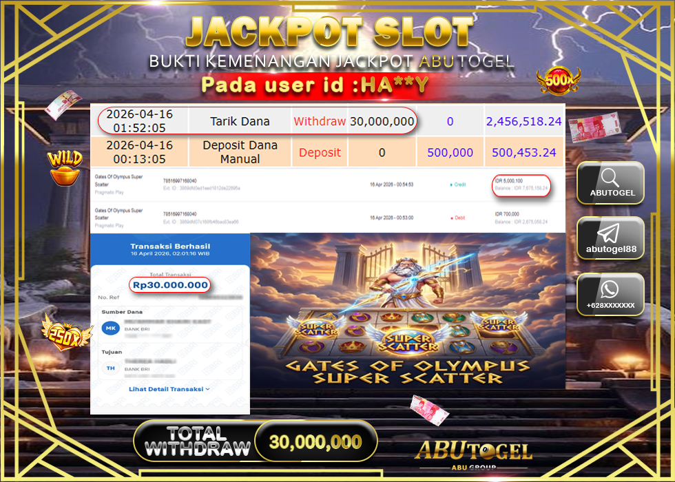 Bukti Jackpot Slot Online ABUTOGEL Kamis, 16 April 2026 RP 30,000,000 - LUNAS