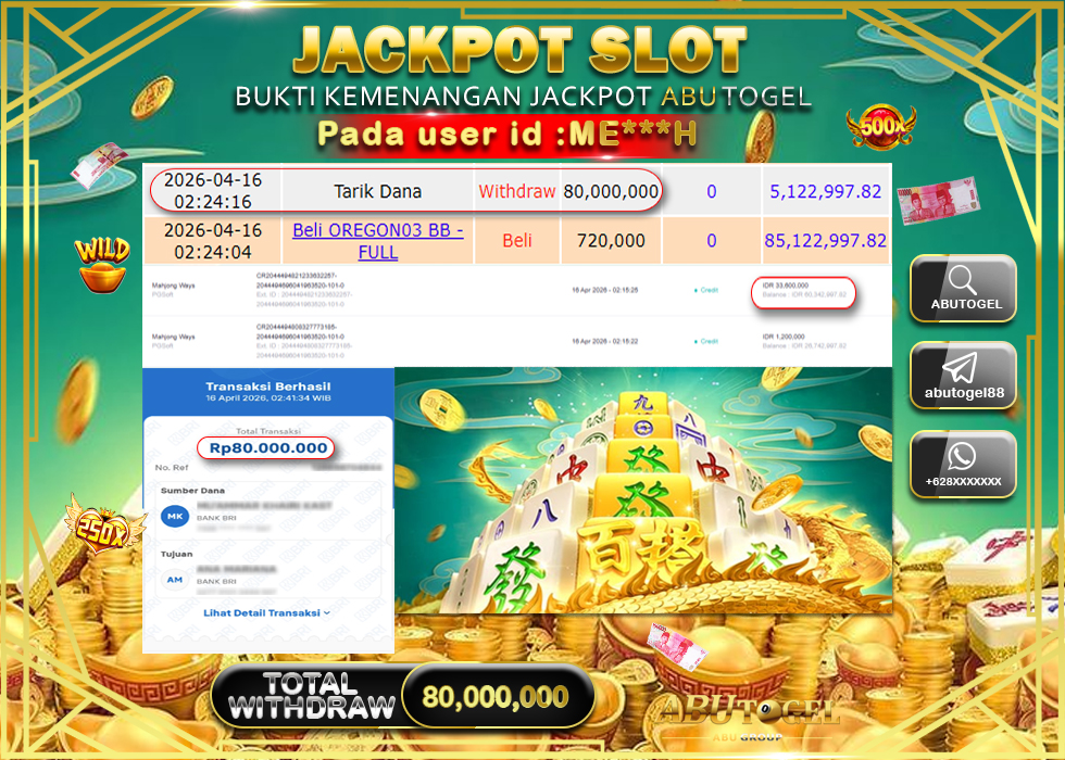 Bukti Jackpot Slot Online ABUTOGEL Kamis, 16 April 2026 RP 80,000,000 - LUNAS