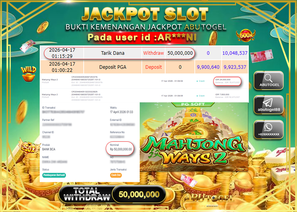 Bukti Jackpot Slot Online ABUTOGEL Jumat, 17 April 2026 RP 50,000,000 - LUNAS