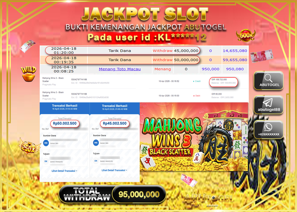 Bukti Jackpot Slot Online ABUTOGEL Sabtu, 18 April 2026 RP 95,000,000 - LUNAS