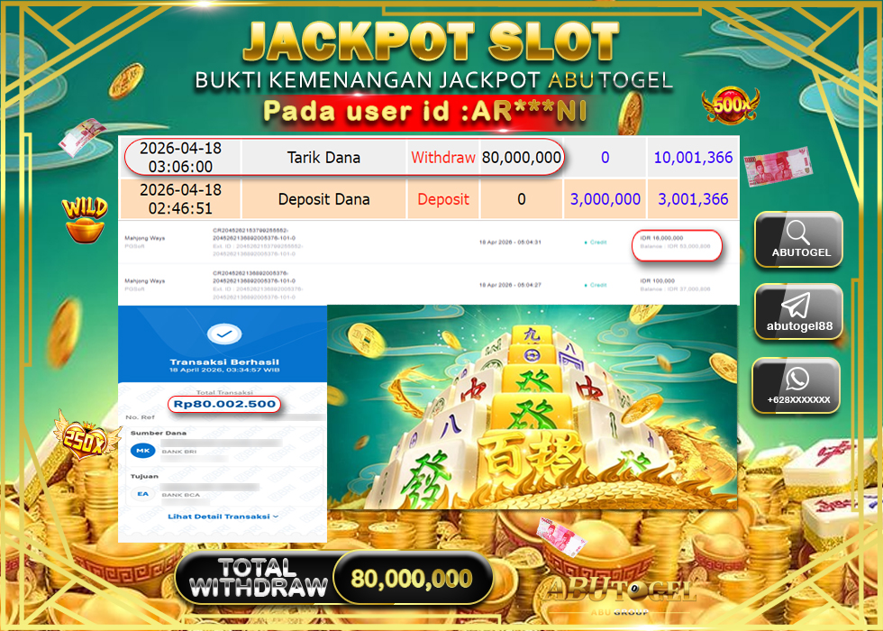 Bukti Jackpot Slot Online ABUTOGEL Sabtu, 18 April 2026 RP 80,000,000 - LUNAS