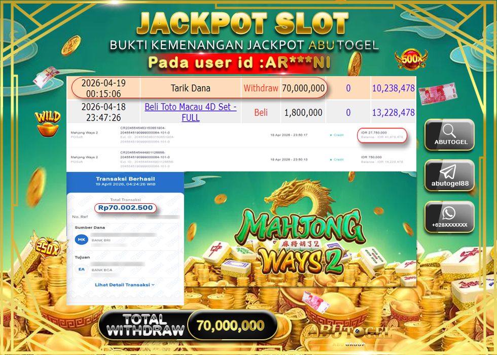 Bukti Jackpot Slot Online ABUTOGEL Minggu, 19 April 2026 RP 70,000,000 - LUNAS