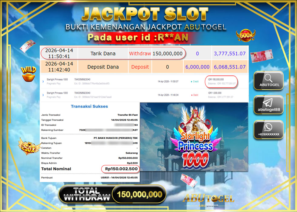 Bukti Jackpot Slot Online ABUTOGEL Selasa, 14 April 2026 RP 150,000,000 - LUNAS