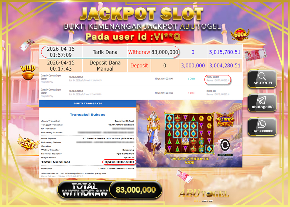 Bukti Jackpot Slot Online ABUTOGEL Rabu , 15 April 2026 RP 83,000,000 - LUNAS