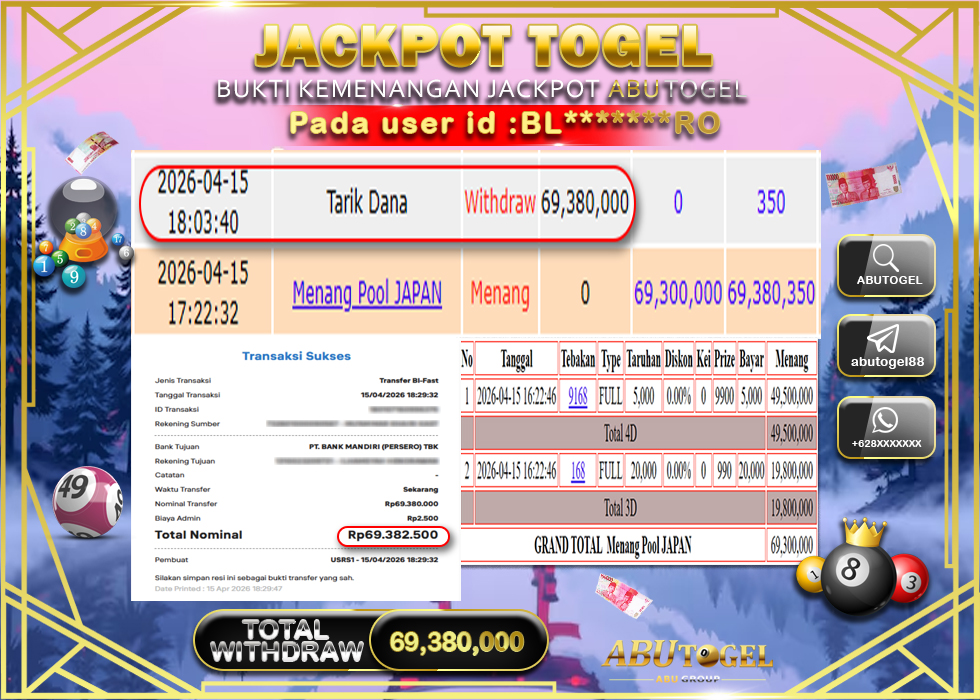 Bukti Jackpot Togel Online ABUTOGEL Rabu, 15 April 2026 Rp 69,300,000 - LUNAS