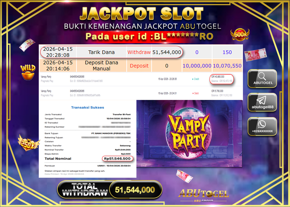 Bukti Jackpot Slot Online ABUTOGEL Rabu, 15 April 2026 RP 51,544,000 - LUNAS