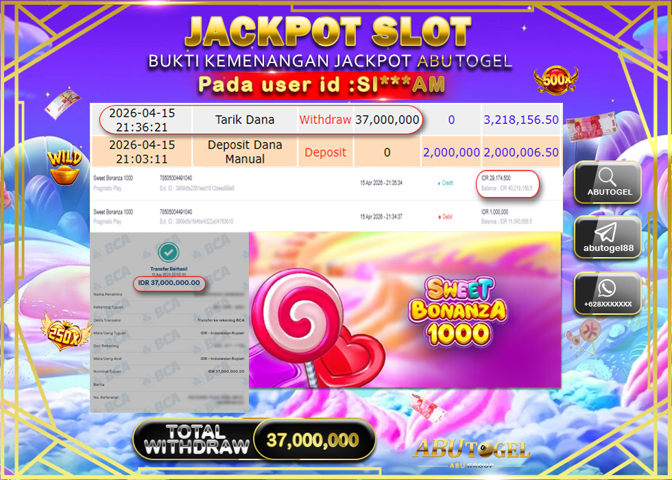 Bukti Jackpot Slot Online ABUTOGEL Rabu, 15 April 2026 RP 37,000,000 - LUNAS